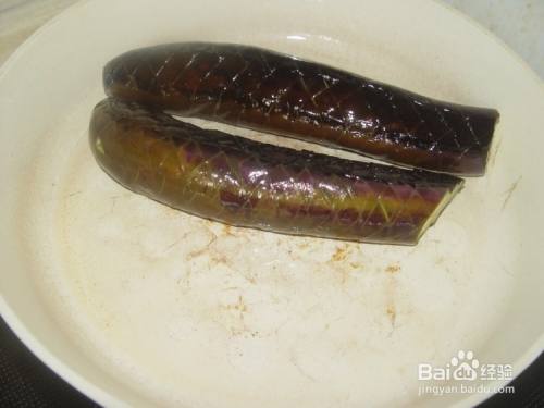 将茄子去除,挤去水分。平底锅烧热,倒油,将茄子放入。