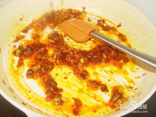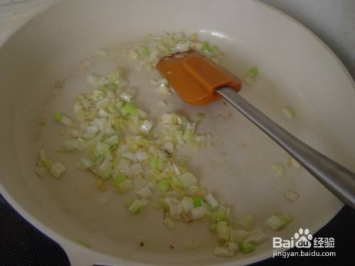 平底锅烧热,倒油,放入葱蒜姜末,煸炒出香味。