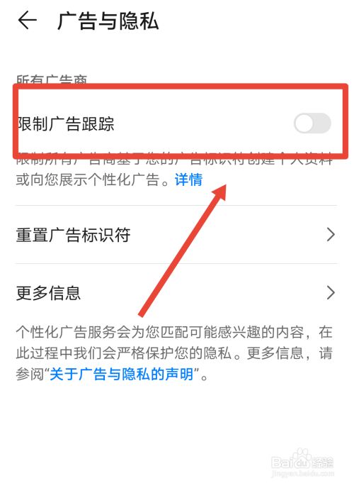 在广告与隐私设置界面的列表中,找到最上方【限制广告跟踪】,将其后方的开关调整为关闭状态,这样就可以关掉广告推送了