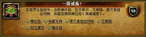 随机Boss:湮灭者(蓝胖子)处获得。需要较高DPS,最好带个萨满,英勇/嗜血,全力DPS RUSH吧,一旦RUSH不掉BOSS,队伍就被大量的虚空斥候RUSH了。黑暗之影能停手的时候还是停停为好。推荐用牧师刷环治疗,加暗抗BUFF几乎是必须的。