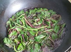 锅中放少烧开,放入红苋菜焯水。焯菜的水留着备用,苋菜捞出过凉水
