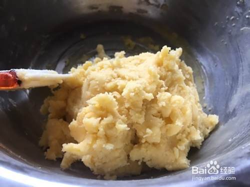 搅拌成无干粉的状态;冬天,比较的冷,黄油也不容易融化,我直接用手和;