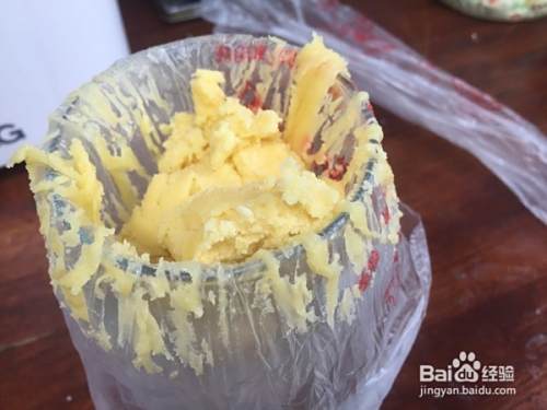 如图,放入裱花袋,里面放入裱花嘴,套在一个比较高的杯子上,放入面团;