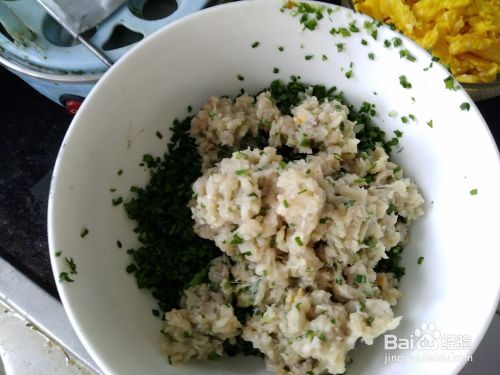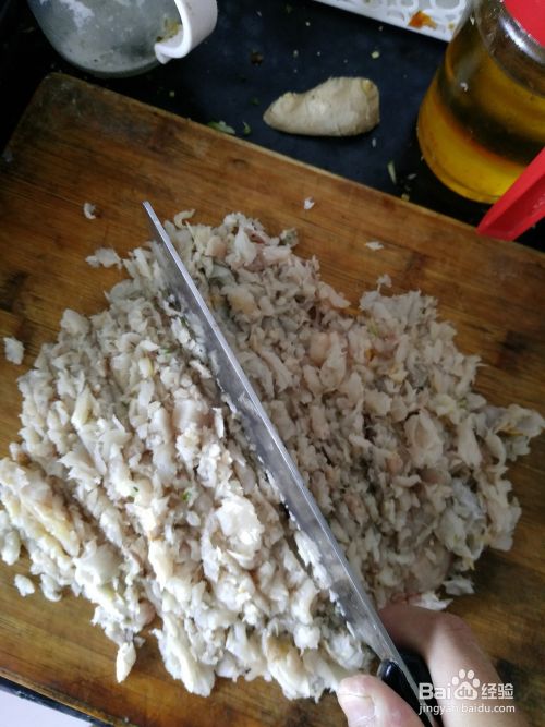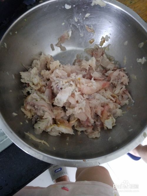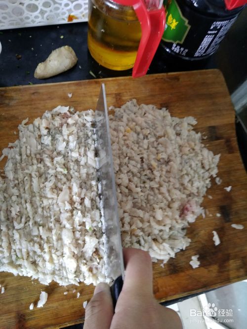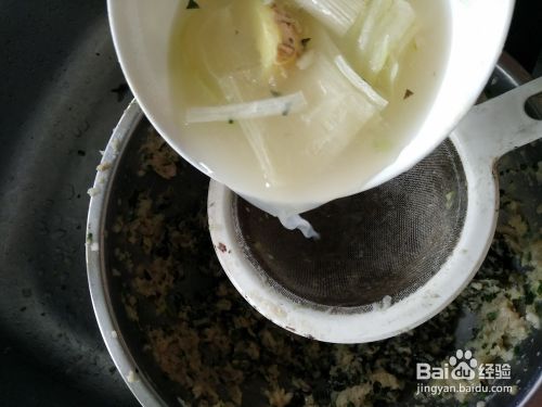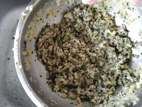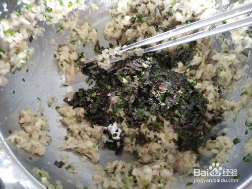 鱼肉泥倒入苏子叶中搅拌,倒入泡好的葱姜蒜水,搅拌馅料添加盐、料酒、香油