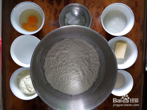 根据家里现有的食材,我让孩子找到了一款她喜欢的且适合我们简单制做的面包配方。以下就是我们按照配方准备好的食材。