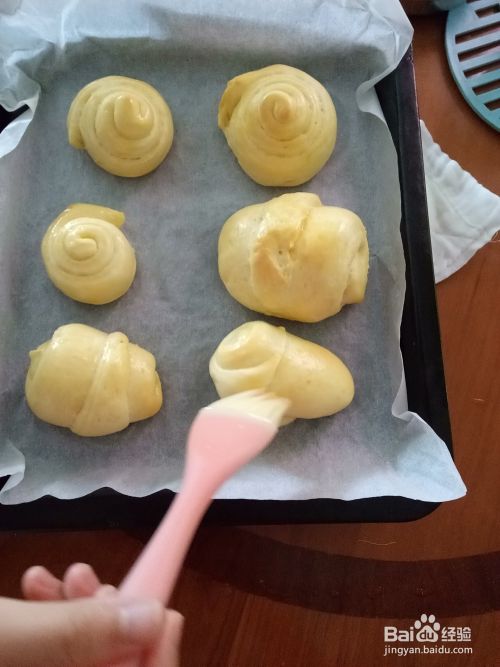 继续第二次发酵,发酵到两倍左右大小时在表面涂上鸡蛋液。