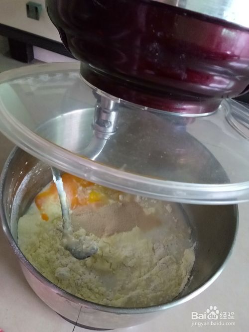 然后用制作面包的搅拌机将食材搅拌在一起。搅拌15分钟后再倒入黄油。再继续搅拌30分钟,搅拌到扩展阶段再到完全阶段是最好的,那样的面包要好吃些,可是为了节省时间,到了面包扩展阶段就拿去发酵了。