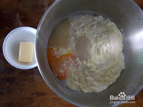 除了黄油,将所有材料倒在一起。糖和盐对角放,酵母放中间。