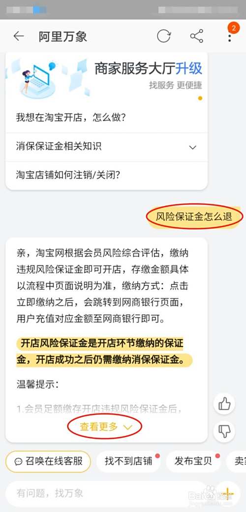 在阿里万象对话框中输入“风险保证金怎么退”,在回复的信息中点击“查看更多”。