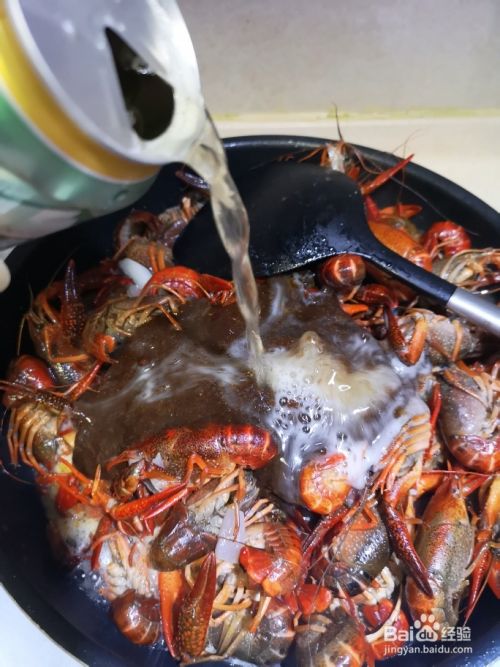 然后倒入啤酒,基本上将小龙虾浸入水中。倒入啤酒,小心搅拌。把调味料搅拌均匀。