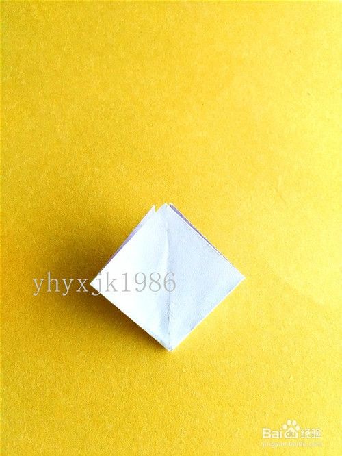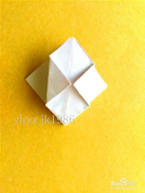 上一步折好的角打开,沿着上面的折痕,大角内折,小角外折,其余三边也同样的折法