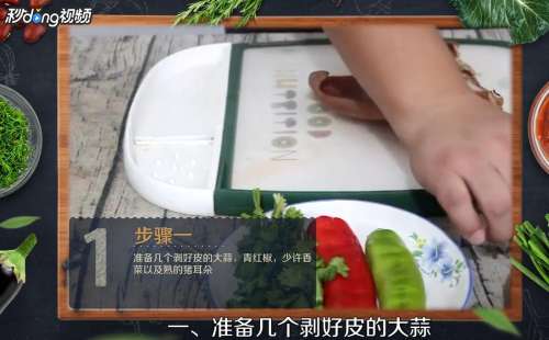 1准备几个剥好皮的大蒜、青红椒、少许香菜以及熟的猪耳朵。