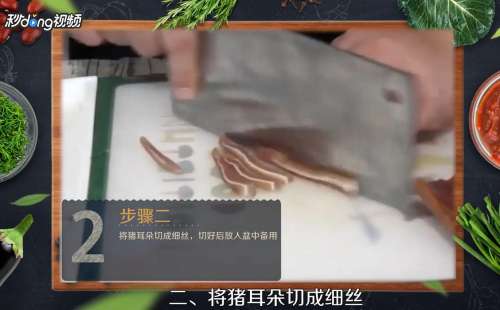 2将猪耳朵切成细丝,切好后放入盆中备用。