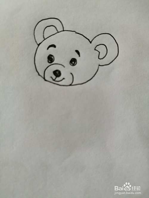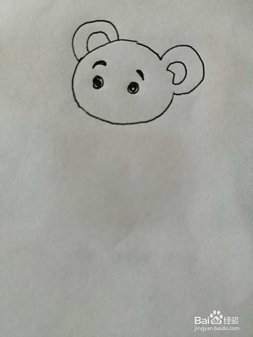 第三步,接着在可爱的小熊的头部面画出弯弯的眉毛和黑色的大眼睛,小熊的眼睛很漂亮。