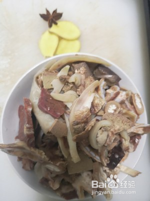 热锅,下油,下姜片和八角,炒几下放羊杂
