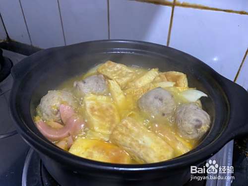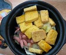 娃娃菜切片,准备丸子和自己喜欢吃的配菜放到砂锅中,上面铺上烤好的豆腐