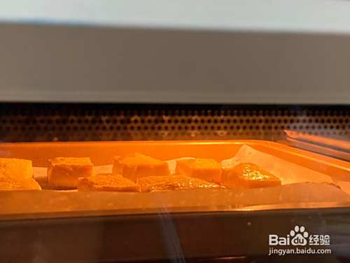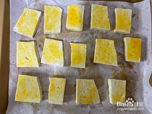 老豆腐切成小块,表面刷一层蛋黄液