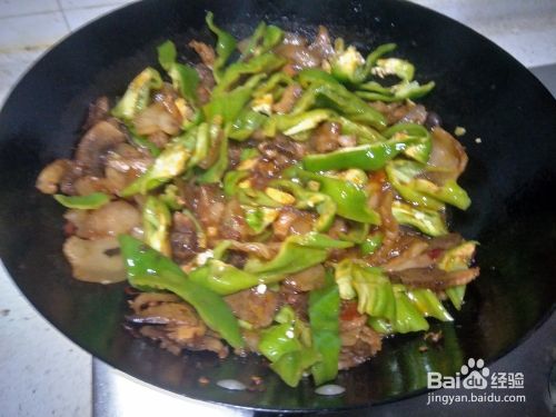 下一步就是倒入切好的青椒,炒一会儿就可以加入最后一道配菜,大葱,翻炒均匀,基本上就ok啦。因为豆瓣本来就比较咸,放盐的时候一定试着来,不要一次性放太多。