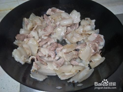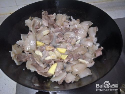 因为这次买的猪肉比较肥,所以就没有加食用油了,直接热锅下肥肉,火先不要太大,不然容易粘锅。等肥肉出油了,可以稍微开大一点儿。但是因为油会飞溅出来,所以火还是不要太大。爆香肥肉一会儿,等肉有些微卷的时候,加入瘦肉,因为瘦肉是单独切的,如果买的刚好就是肥瘦相间的猪肉,就没这么麻烦。然后丢入大蒜,姜片吃,花椒。翻炒均匀。