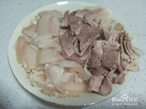 首先肯定就是准备工作啦。把猪肉洗干净,然后放冷水里煮,加两片老姜去腥,肉一定要煮熟,用筷子一插就进去那种,就差不多啦。按照蒜泥白肉的做法煮肉和切肉即可。