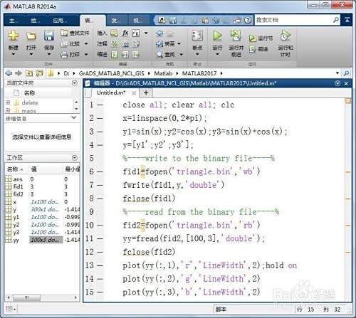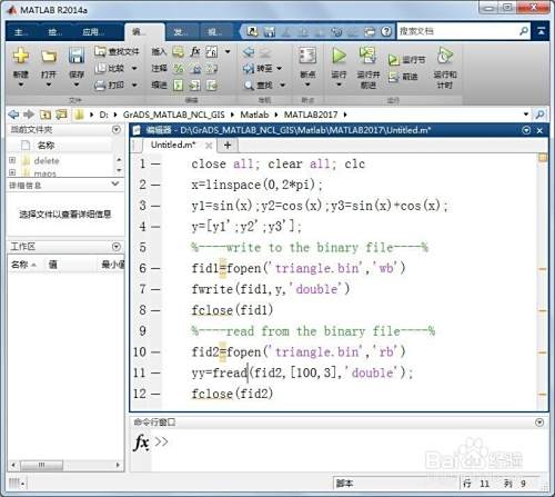 第一,启动MATLAB,新建脚本(Ctrl+N),输入如下代码,分别进行二进制数据文件的写入和读取。