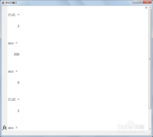 其中fid1=3,fid2=3表示fopen( )打开二进制文件成功(大于0就表示打开成功),ans=300表示fwrite( )写入了300个数据,两个ans=0表示fclose( )关闭二进制文件成功。
