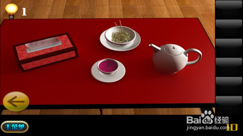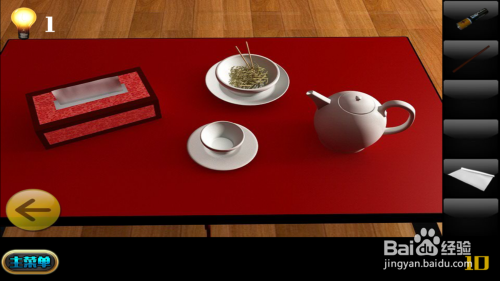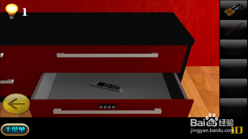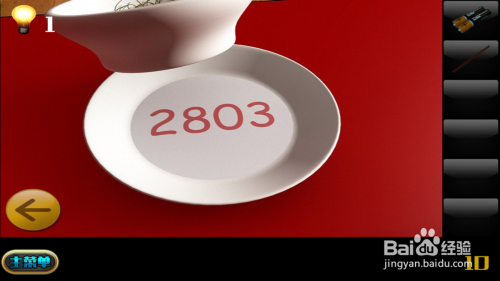 接着,在茶几上的碗下面,用面巾纸擦拭碟子上的红色遮痕,获得4位数密码2803,用密码打开电视柜右边的密码锁,获得电视遥控器一个。