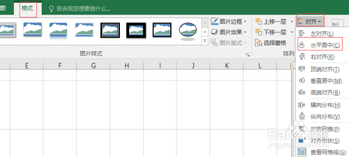 保持它们的选中状态,选择菜单栏上的“格式”按钮,设置水平居中对齐,设置垂直居中的话需要注意,图片的高度是否全部相同,所在单元格的行高是否相同,如若一点不相同,垂直居中后图片会跑出单元格。(例子中的图片大小不相同)