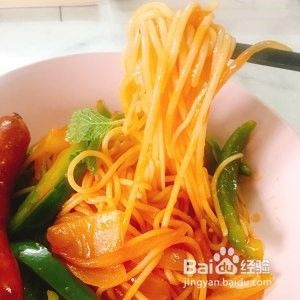 煮意面:深锅放大概适量多的水,水滚后放一点橄榄油一勺盐,放意面煮10分钟。煮意面的时候准备配菜,将青椒和洋葱切细条