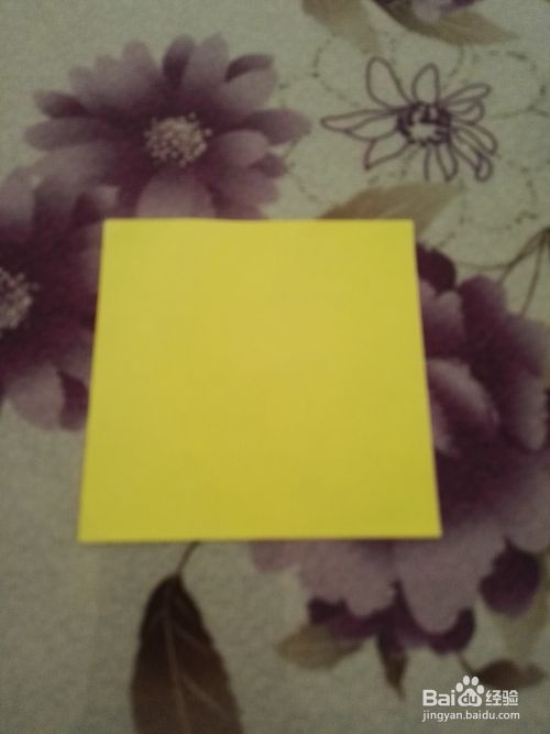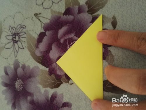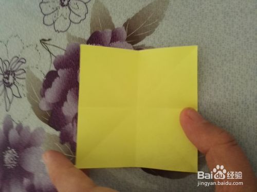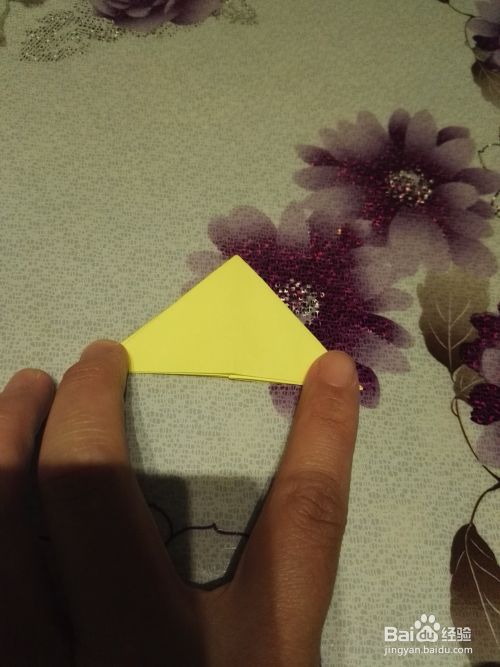 准备一张正方形彩纸,先沿对角十字型对折后展开,然后中线横纵向对折,全部展开,用水根据折痕按压成一个大三角,如图。