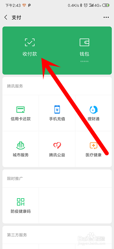 在支付界面,我们点击收付款,在收付款界面,我们点击二维码收款。