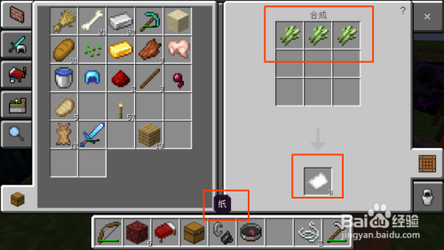 获得甘蔗后,直接到工作台里,在右边九宫格中,第一、二、三格放入甘蔗,合成纸