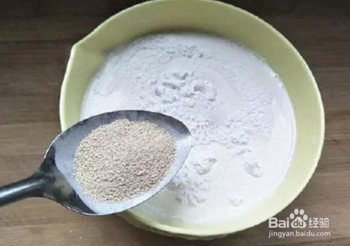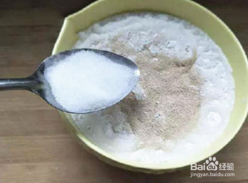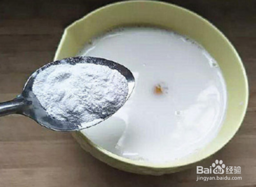 牛奶倒入碗中,打入鸡蛋,加一大勺泡打粉