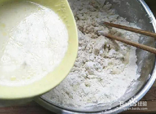 将搅拌后的牛奶分三次倒入面粉中,搅匀