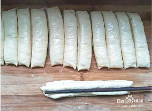 面醒好后,用刀切成长条,取两根,用筷子一压,取出筷子后两头捏紧并拉长