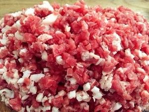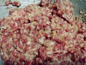 静置的入味的过程中切葱,把葱也切成与肉末差不多大小的末(0.5*0.5cm),将切好的葱末倒入肉末中。同样朝一个方向搅拌均匀。