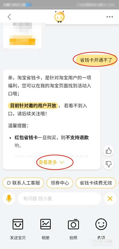 在对话框中输入“省钱卡卡通不了”,在回复的信息中选择“查看更多”。