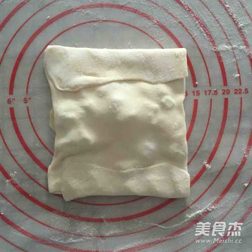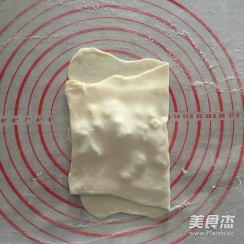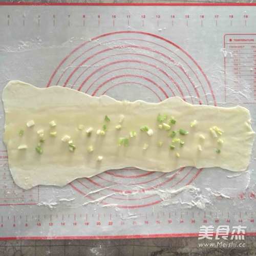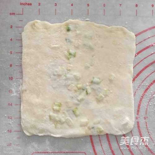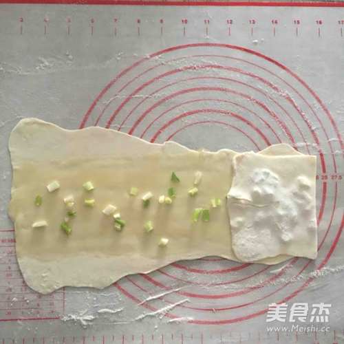 4擀薄片,抹匀油酥撒葱花,宽边的两侧不抹油酥