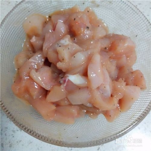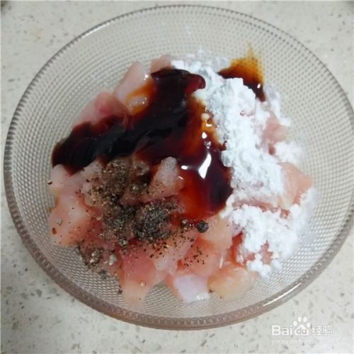 鸡肉中调入适量的盐、生粉、蛋清、黑胡椒粉、料酒和蚝油,抓匀腌渍10分钟。