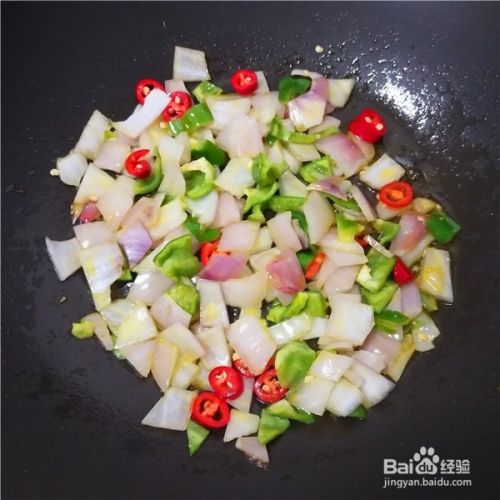 热锅凉油,倒入青红椒和洋葱片,调入适量的盐、醋和白糖,大火翻炒均匀。