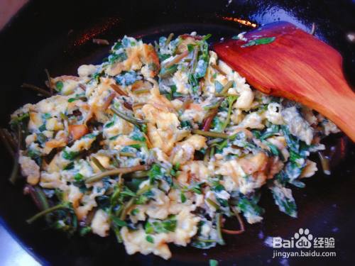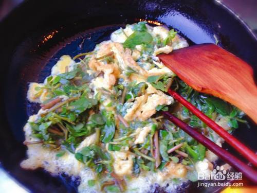 翻炒均匀即可关火,鲜香美味的马齿苋炒鸡蛋就做好了。