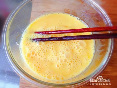 把鸡蛋打入碗中,加入1g盐,然后用筷子搅打至蛋清和蛋液完全融合,蛋液表面有一层细碎泡沫就好了。