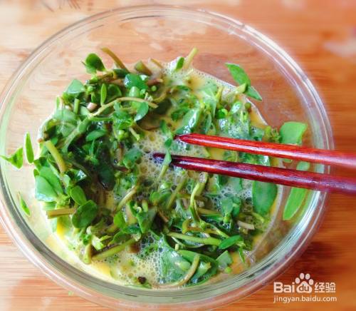 将切好的马齿苋放入鸡蛋液中搅拌均匀。