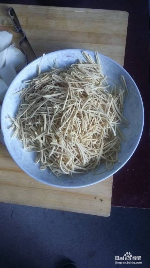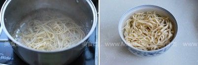 切好的豆腐丝用开水焯一下,继而用冷水冲,并沥干水分。