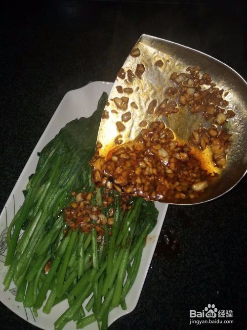 将蒜酱浇在盛好的油菜上,一盘色香味俱全的油菜就做好了