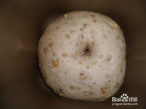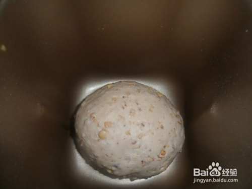 第一个程序结束后,放入黄油,核桃碎块继续揉面,直到将面团揉至完全阶段即可