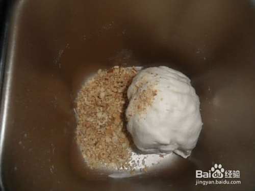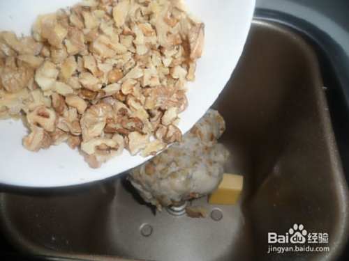 将除黄油外的所有制作面团的材料放在一起,揉至扩展阶段,面包机第一个程序还剩4分钟时将切碎的核桃加入面团中,继续揉面