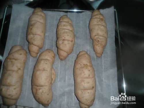 将整形好的橄榄形面团摆在烤盘上,进行最后的发酵