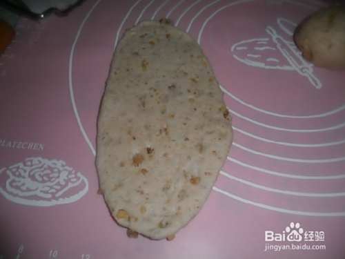 取一个小面团放在台面上,用手掌压扁,然后用擀面杖擀开呈椭圆形