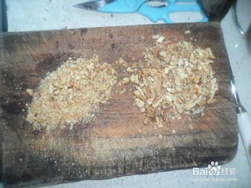 核桃仁放入预热好170℃的烤箱中层,烤8-10分钟,烤至金黄色,烤好的核桃仁,冷却后,均匀分成两份。一份切碎成小块,另一份切成粉状